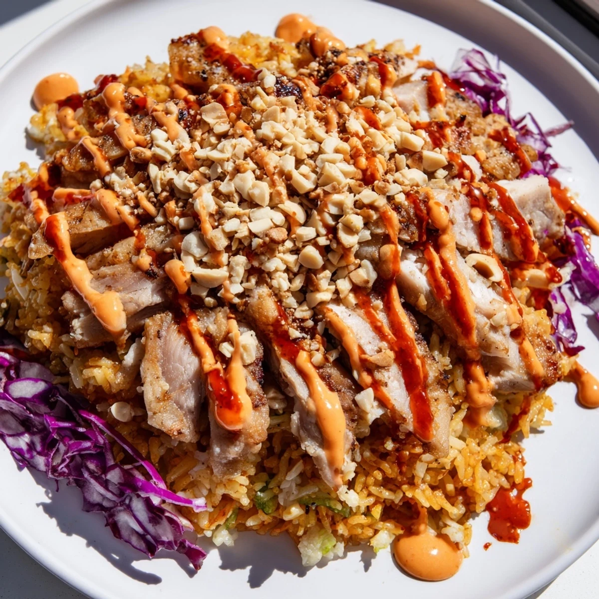 This vibrant dish brings together crispy golden rice, juicy grilled chicken, and crisp fresh vegetables in a harmonious bowl. The signature Bang Bang sauce—a creamy blend of mayonnaise, sweet chili sauce, and Sriracha—ties everything together with just the right amount of heat and sweetness. Perfect for those who love contrasting textures, each bite delivers satisfying crunch from the rice and peanuts, tender chicken, and refreshing vegetables.