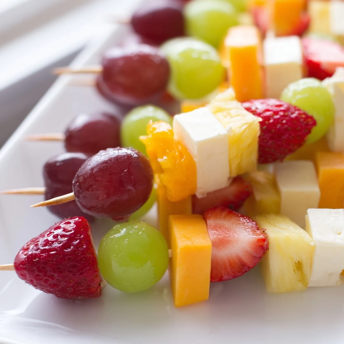 Firm fruits like grapes, strawberries, pineapple chunks, melon, and kiwi work beautifully. They hold their shape on skewers and pair wonderfully with cheese. For apples, dip in lemon juice to prevent browning.