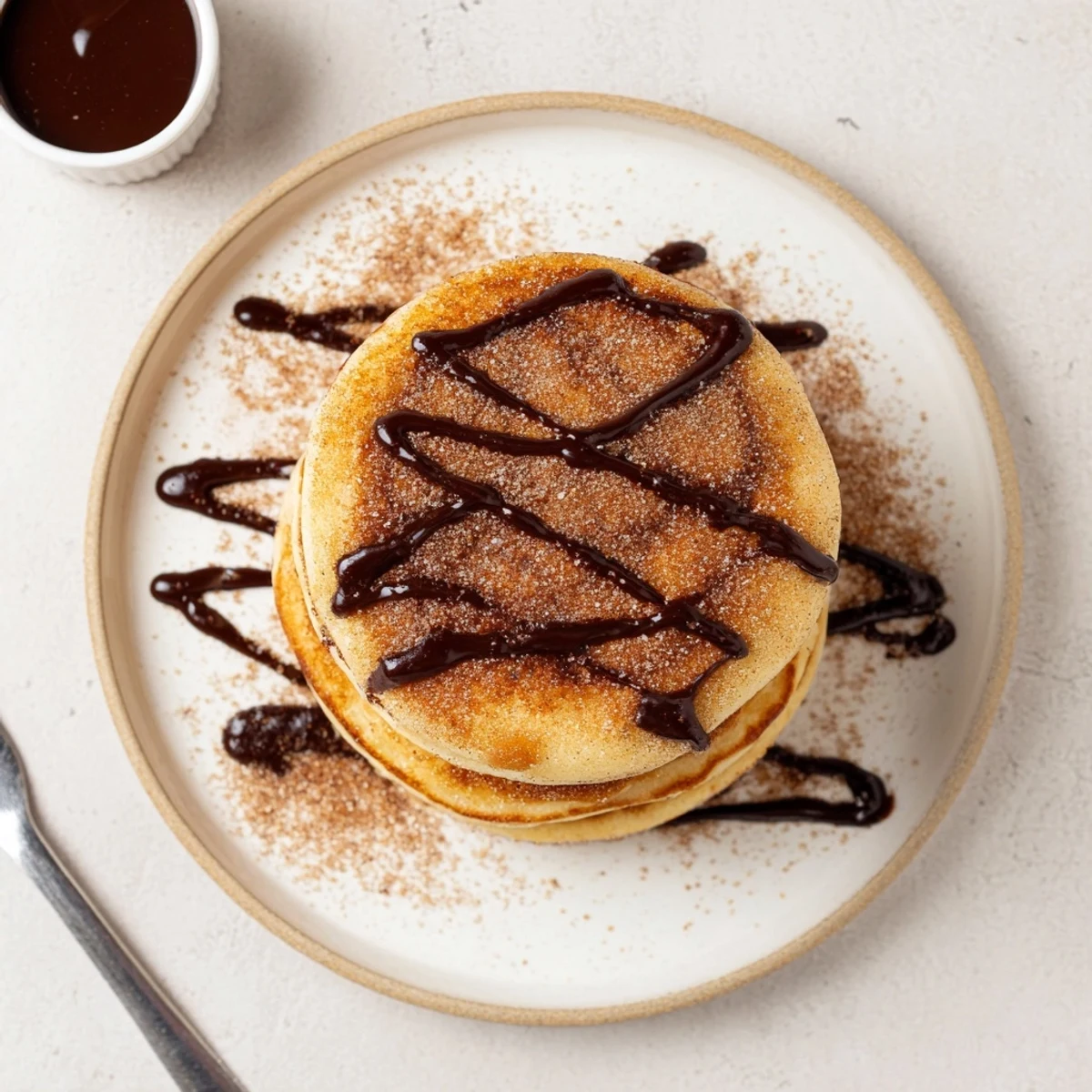 These Spanish-inspired churro pancakes combine the best of both worlds—fluffy, golden pancakes coated in cinnamon sugar like traditional churros. Each bite delivers warm, vanilla-scented batter with that signature sweet-spicy crunch, complemented perfectly by a silky dark chocolate dipping sauce.